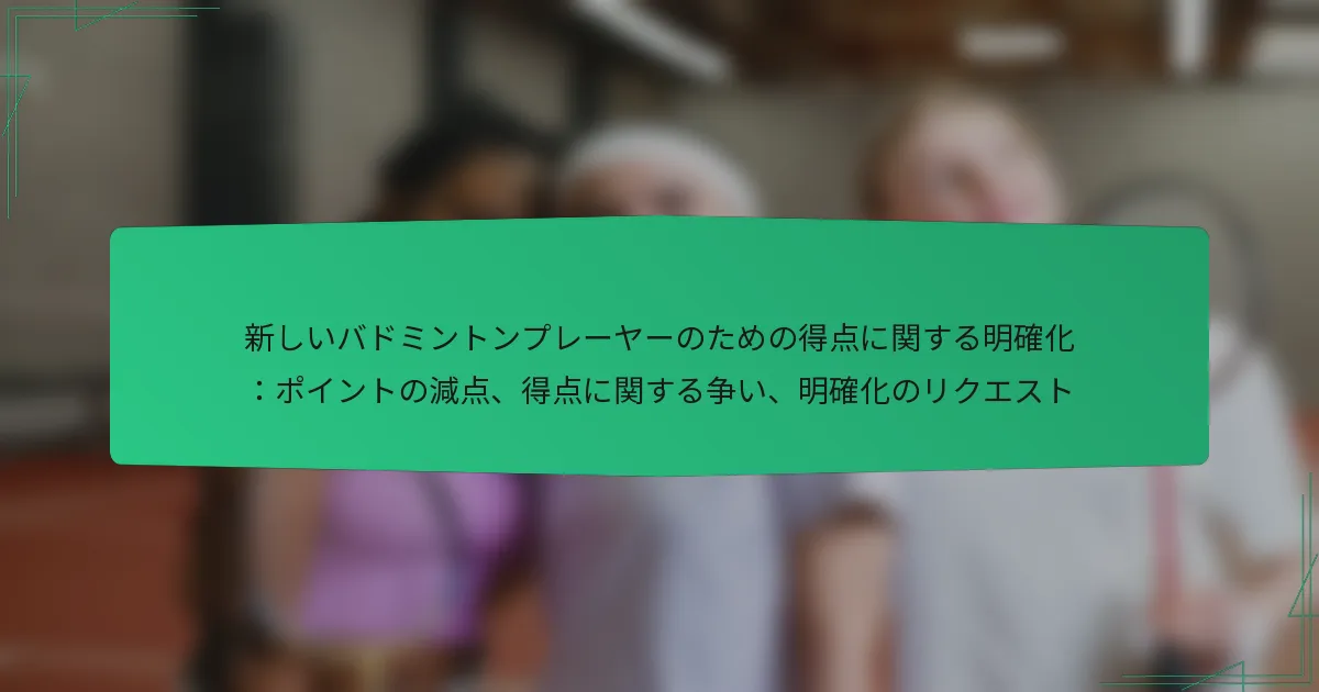 スコアリングの明確化を理解することは、新しいバドミントンプレーヤーがゲームの複雑さを乗り越えるために不可欠です。ポイントの減点は試合の結果に大きな影響を与える可能性があり、スコアに関する争いを解決する方法を知ることは公正なプレーのために重要です。プレーヤーは、コートでの体験を向上させるために、ルールや明確化を求めるための適切な手続きを理解しておくべきです。